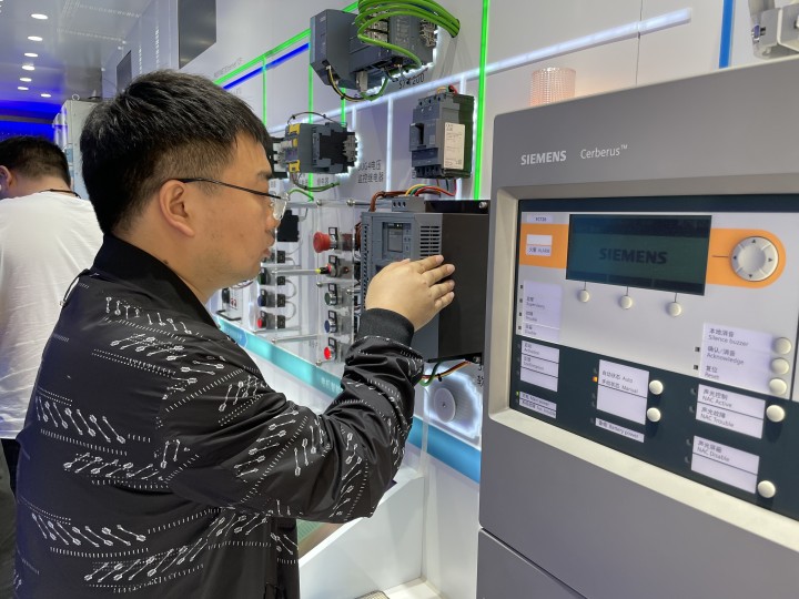 一辆集装箱大卡车别出心裁地装饰成移动的“会展中心”,印有西门子标志的旗帜迎风飘扬,车身“共创智能基础设施新生态”几个大字格外醒目。